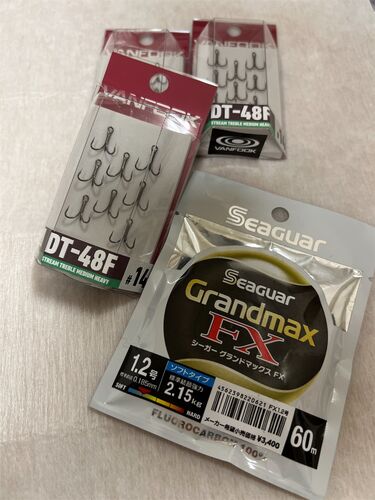 ネイティブトラウト用のトレブルフックはヴァンフック製を使っています 今回はミディアムヘビーワイヤーのDT-48Fを購入 ※14番 このフックはPEライン専用との事、リマリックベンド形状で強めのフッキングに対応しているらしい そしてミディアムヘビーワイヤー…